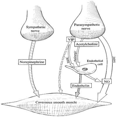 Μέσω των νευρικών ινών, ως γνωστό, που ξεκινούν από τα σηραγγώδη σώματα και φθάνουν μέχρι τις λείες μυϊκές ίνες των σηραγγωδών αρτηριών, τα ερεθίσματα διεγείρουν την απελευθέρωση νευροδιαβιβαστών.