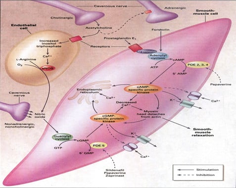 Συγχρόνως επιτελείται η ενεργοποίηση ειδικών φωσφοδιεστερασών με κύρια την 5 φωσφοδιεστεράση, ενώ κατ’ επέκταση διακρίνεται η επίδραση όλων αυτών των αντιδράσεων στα μυϊκά κύτταρα του σηραγγώδους σώματος του πέους.