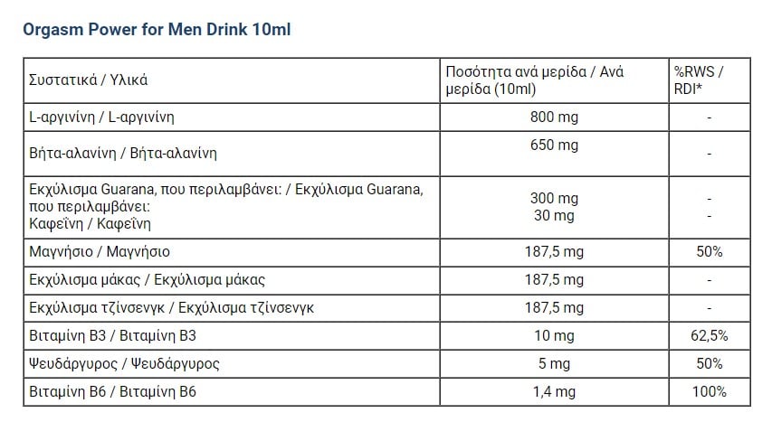 | Συστατικά | εκχύλισμα ρίζας maca 4:1, εκχύλισμα ρίζας ginseng 4:1, L-αργινίνη, ζελατίνη, καφεΐνη, μαλτοδεξτρίνη, αντισυσσωματικό: άλατα μαγνησίου λιπαρών οξέων, χρωστική: indigo carmine. |
