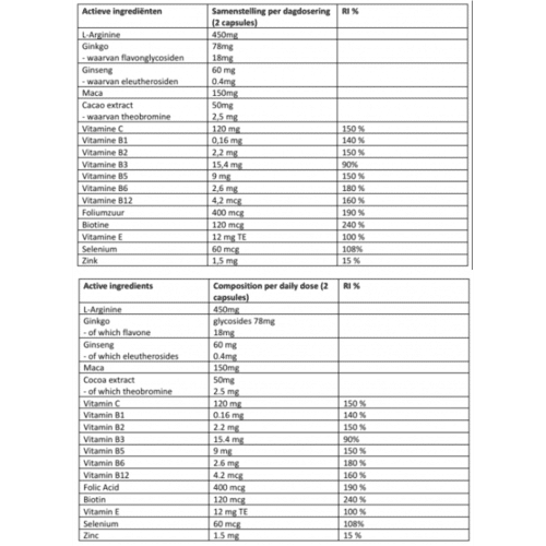 Συστατικά : Κέλυφος κάψουλας σε μορφή σκόνης σε βάση L-αργινίνης: υδροξυπροπυλομεθυλοκυτταρίνη, μάκα, καρότο, 4:1 εκχύλισμα, 90% σκόνη, διένυδρο ασκορβικό ασβέστιο (83% Βιτ. C), σκόνη, ginkgo biloba 24% γλυκοζίτες 50:1 εκχύλισμα σκόνης, εκχύλισμα Siberian Ginseng 4:1, 90% σκόνη, φασόλια κακάο (12% πολυφαινόλες) Εκχύλισμα 90% σκόνη, D-Alpha Tocopheryl Acetate (700 IU/g Βιτ. Ε) Σκόνη, Νικοτιναμίδιο (Βιτ. Β3) Σκόνη – VEGAN, σεληνικό νάτριο, γλυκονικός ψευδάργυρος, D-παντοθενικό ασβέστιο, υδροχλωρική πυριδοξίνη, ριβοφλαβίνη, φολικό οξύ, μονονιτρική θειαμίνη, D-βιοτίνη, μεθυλοκοβαλαμίνη.